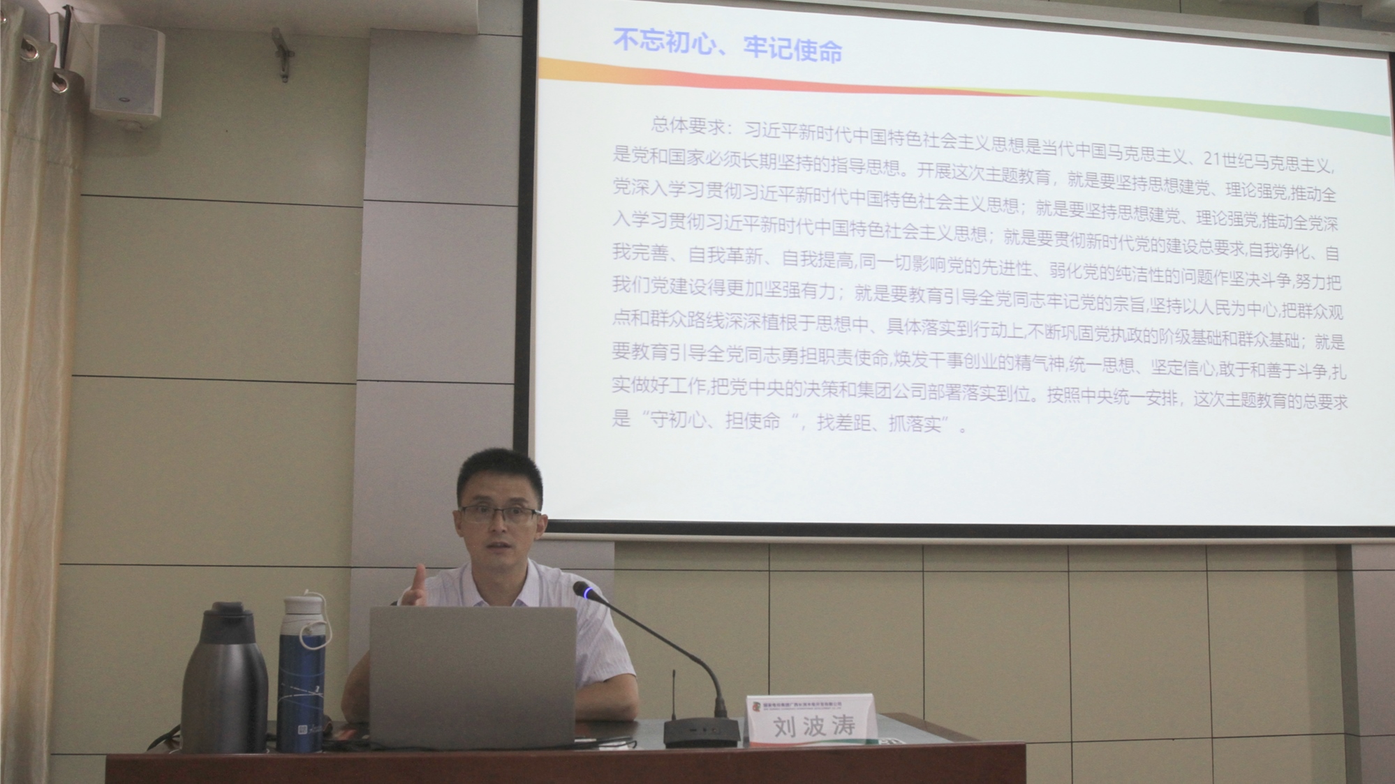 7月11日上午,刘波涛在卓洁长洲分公司为全体党员干部讲“不忘初心、牢记使命”主题党课,详细解读了“不忘初心、牢记使命”主题教育的总体要求和重大意义,并结合集团公司、广西公司以及检修公司的战略定位和目标,对检修公司广大青年员工提出三点要求:一是要志存高远,坚定奋斗信念,孜孜不倦地在最基层、最艰苦的岗位上接续奋斗;二是要丰盈知识,锤炼过硬本领,在公司发展的征途中谱写独一无二的青春华章;三是要勇立潮头,增强担当意识,在挑战面前不懦弱、不逃避,勤作为、勇作为,保持一种功成不必在我、但建功必定有我的担当精神,为公司开创光辉的未来贡献一份力量。