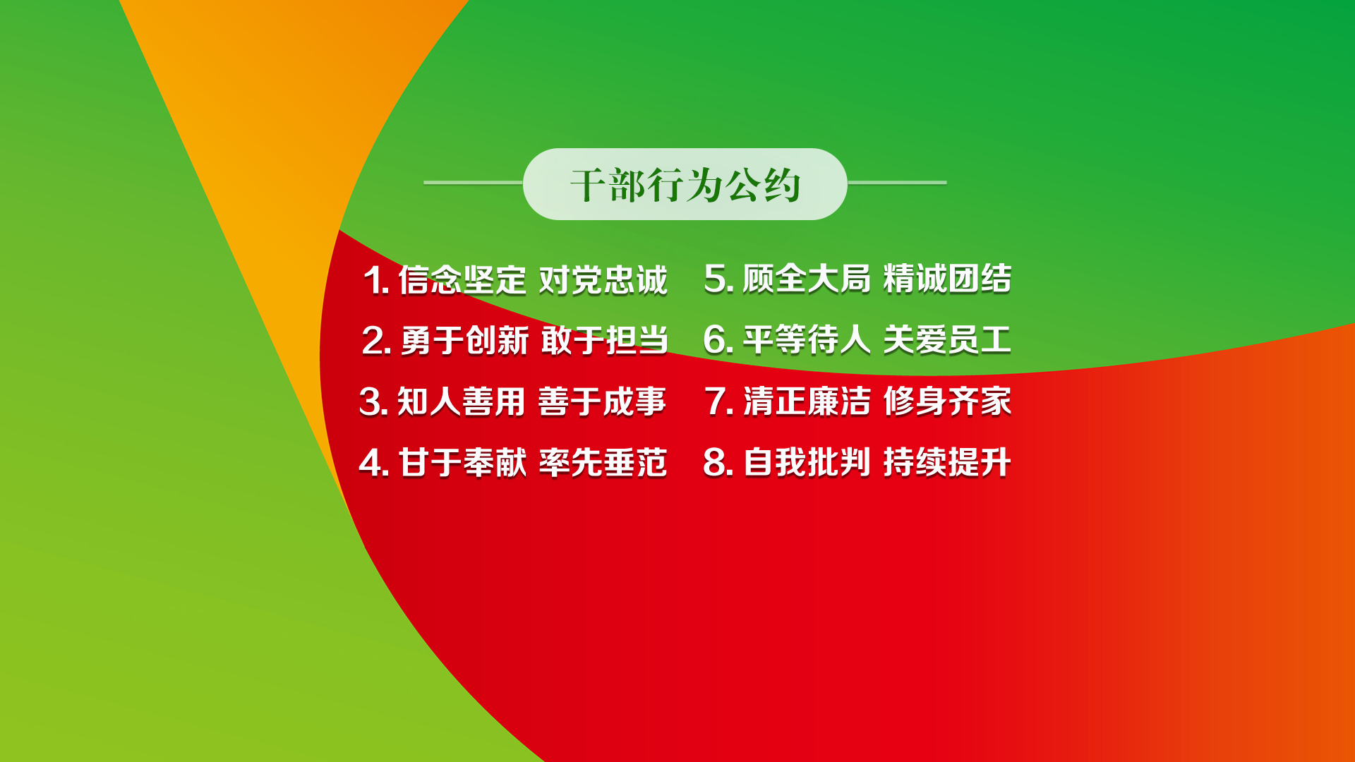 2.勇于创新 敢于担当。 引领创新意识,营造创新氛围,以敢为人先的锐气,主动拥抱变革;要有“为了完成任务,必要时不惜打破成规”的智慧和判断力,主动作为;要有“功成不必在我”的境界和“功成必定有我”的担当。要有肯干事、真干事、干成事的魄力,敢于“揭榜挂帅”、接硬任务、扛硬指标,“敢啃硬骨头,敢于涉险滩”。 3.知人善用 善于成事。 善于在工作中发现人才、培养人才、成就人才,做到人尽其才,才尽其用,最大限度地调动广大干部员工干事创业的积极性;有意识地带领团队一起工作,提供平台给团队成员,对他们的工作结果和成长负责;树立正确的业绩观,既要做显功,也要做潜功;追求目标达成,不要决而不行,不要重痕不重绩。 4.甘于奉献 率先垂范。 服务国家电投“2035一流战略”,始终坚守初心、立足岗位,任劳任怨,吃苦在前,享受在后,不图虚名,不计较个人得失;注重形象影响,始终做到冲在前、干在前,既挂帅又出征,经风雨、见世面、长才干、壮筋骨,以上率下、以身作则。 5.顾全大局 精诚团结。 坚守大局意识,始终以事业为重,以大局为重,不把个人意志凌驾于组织之上;自觉维护团结,对事不对人,尊重他人意见,决策前充分讨论,决策后共同推进;严于律己、宽以待人,相互理解、相互支持;发挥领导班子的整体功能,同心同德、团结协作。 6.平等待人 关爱员工。 秉公用权、公道处事,时刻做到平等待人,不居高临下,不厚此薄彼;把关心关爱员工作为一种习惯,走近职工、了解职工、帮助职工,做职工群众的朋友;为想干事、能干事、干成事的员工搭建舞台,创造条件,成就员工。 7.清正廉洁 修身齐家。 常怀律己之心,始终做到心有所畏、言有所戒、行有所止,严格遵守党纪国法;明大德、守公德、严私德,自觉接受监督,坚决反对享乐主义和奢靡之风,清白做人,干净做事;高度重视家风建设,弘扬真善美,崇德向善、见贤思齐,培育良好生活情趣。 8.自我批判 持续提升。 以刀刃向内的勇气,经常审视反思,勇于自我否定,敢于直面不足;经常开展自我“三问”,从认识、能力、行动上不断改进提高,实现自我革新、自我赋能、自我提升;用好绩效面谈,做得好的要充分表扬,不足的地方要及时提醒,不断提升团队的战斗力。