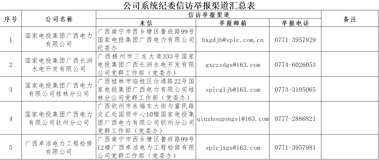 广西公司系统纪委信访举报渠道汇总表